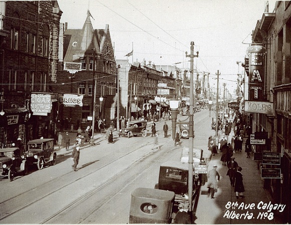 [Next column] "8th Avenue Calgary Alberta," detail from postcard published by McDiarmid Photo Laboratories, Calgary, circa 1930. (Source: University of Alberta, Peel's Prairie Provinces, Postcard 5389)