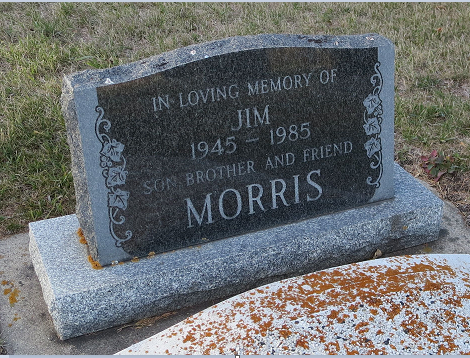 [Next column] Jim Morris is buried in Alix Cemetery, Alberta, in the Morris family plot with his mother and father. Photo by Aaron C. Shaw (detail). (Source: Find a Grave.)