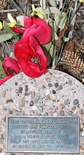 [Next column] The plaque reads "This thunderchild crabapple was planted in loving memory of Trevor O'Dell on October 6, 1995 by friends and co-workers." Another tree with a similar memorial to Alexia Lema is located nearby. Both are in small park across the street from where they died. (Source: Norman Beattie)