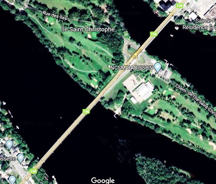 [Next column] Duplessis Bridge from Trois Rivières (lower left) to Cap-de-la-Madeleine (upper right). (Source: Google Maps)