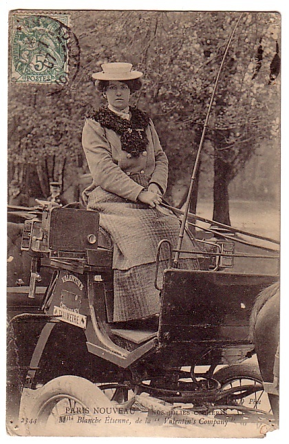 Picture (left): Our Pretty Cabwomen. Mlle Blanche Étienne of the "Valentin's Company" The big beneficiary of the publicity surrounding the femmes cocher seems to have been the "Valentin’s Company" so prominently featured in many of the postcards. Could it be that this company actually orchestrated the publicity? Did the company deliberately use the novelty of women drivers to drum up business for their declining trade? Did they recruit and sponsor a group of women who were willing to take on the apprenticeship course and the police exam? And did the company work behind the scenes to defuse any political and bureaucratic opposition to their scheme?