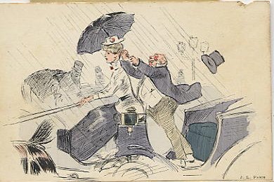 Humour / 6 Picture (left): Cochères.A gallant gentleman passenger feels obliged to shield his driver from the elements.
