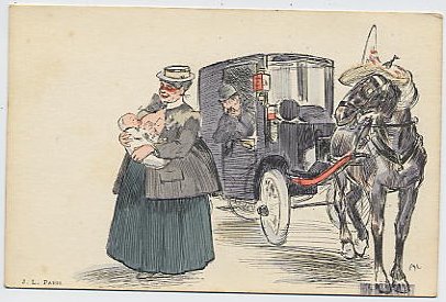 Les Femmes Cocher / 108 Humour / 8 Picture (left): Cochères.A woman driver interrupts a trip to nurse her baby while the passenger waits.