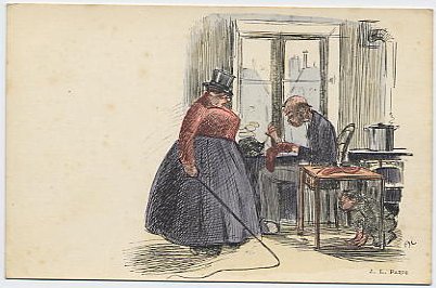 Picture (left): Cochères. A formidible woman driver rules the roost while her henpecked husband darns his own socks. Compare the picture of Madame Moser devotedly darning her husband's socks while waiting for a fare. (Mme. Moser, 10)
