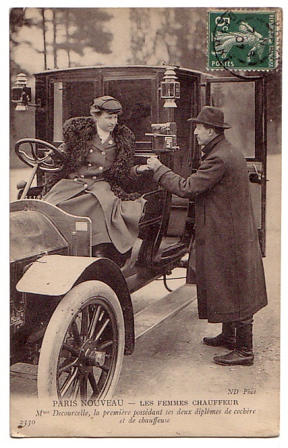 Picture (left): Mme. Decourcelle, the first woman to possess her two diplomas for horse-cab driver and chauffeur. Femmes chauffeur were much more numerous just before World War I when the American humourist Alexander Woollcott rode with one of them: Once in pre-war days, when curiously bonneted women drivers were familiar sights at the taxi-wheels, I cried out to one in my dismay: "Is there no speed limit in this mad city?" "Oh, yes, monsieur," she answered sweetly over her shoulder, "but no one has ever succeeded in reaching it."