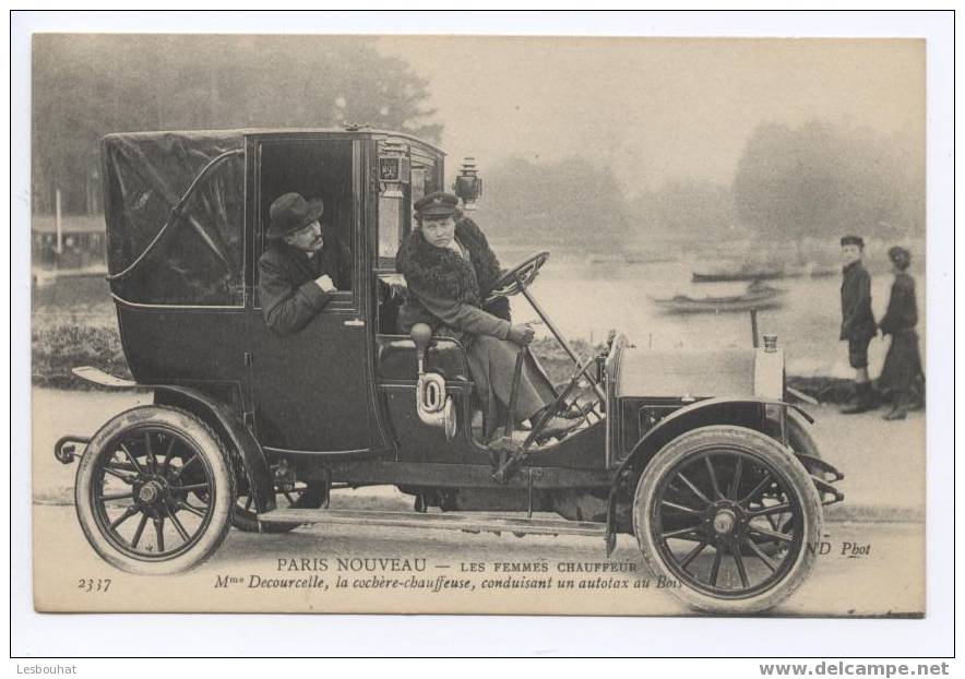 Picture (left): Mme. Decourcelle, the horse-cab driver / chauffeur, driving a taxi in the Bois de Boulogne. The first woman to apply for a London taxi license was Sheila O'Neill, in 1908. The Public Carriage Office frostily rejected her application ("Licenses to act as hackney carriage [cab] drivers are not granted to females.") O'Neill, a former nurse who had served in South Africa during the Boer War, drove a hire car for a group of businessmen instead. Her hood ornament was a small metal policeman who faced the windshield with his hand raised, pointlessly commanding her to stop. The first woman to drive a taxi in the U.S. may have been Natalie White, whose 1910 debut as a New York "chauffeuse" was widely reported.