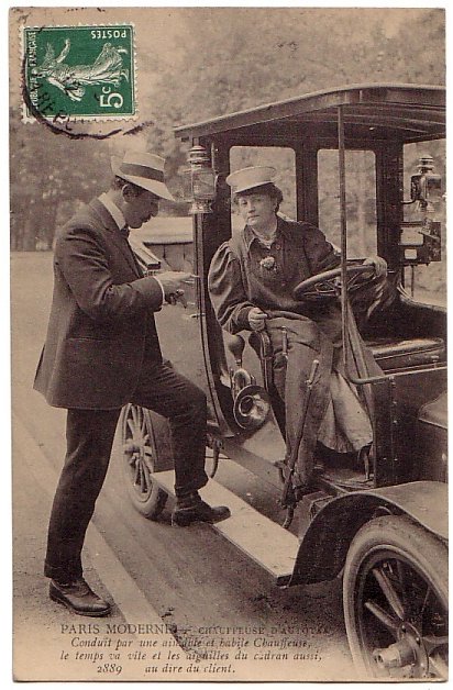 Picture (left): Driven by an aimiable and skillful driver the time goes quickly and so does the meter, as the customer says. The Decourcelle postcards were staged in the Bois de Boulogne with a Fiat taxicab and a small supporting cast.