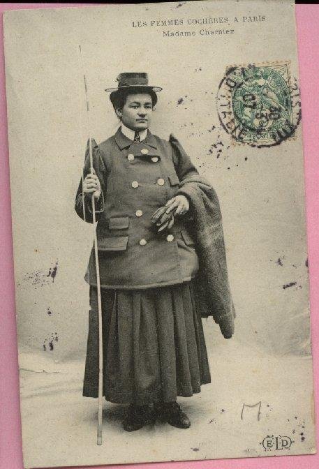 Picture (left): Mme. Charnier. Mme. Charnier and Mme. Clementine Dufaut were the first two women to be licensed as Paris horse-cab drivers. Mme. Charnier is shown here with her whip, gloves and the heavy blanket drivers used to protect themselves (not the horses) from the elements. Mme. Charnier, like her early colleagues, is obviously a mature, strong woman well able to cope with the rigours of cab driving. This suggests that whoever was behind the introduction of woman drivers wanted them to be competent and professional and not mere decorations for a publicity stunt.