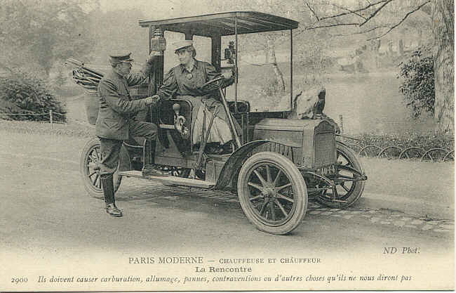 Picture (left): The Meeting. They must be chatting about carburation, ignition, breakdowns, traffic tickets and other things they don't talk to us about. Apparently there was at least one male chauffeur who did not regard women drivers as a threat.