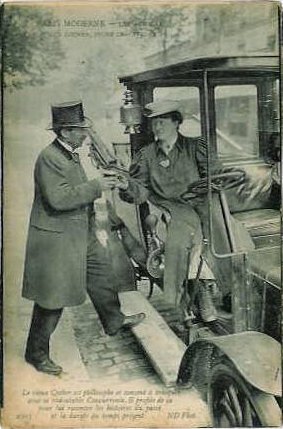 Picture (left): Old Horse-cab Driver, young Chauffeuse. Most veteran drivers were unable to make the transition from horses to automobiles and their livelihood vanished with the horse cab. The Compagnie Générale des Voitures à Paris (CGV) introduced electric cabs in 1899 and recruited 116 of its horse-cab drivers for training as chauffeurs. Only 31 of the candidates passed the training course while 48 dropped out. In 1907, when its first gasoline-powered cabs were put into service, the CGV was still trying to hire all its chauffeurs from within the company. But not enough horse-cab drivers were able to pass the increasingly stringent police examination or to contend with the complexities of car driving and by 1908 the CGV was forced to look elsewhere for recruits.
