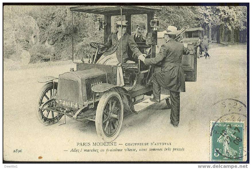 Picture (left): Get going! Drive in third gear, we're in a big hurry. Speedometers did not become standard equipment on cars until the 1920s. Top gear, high gear or, in this case, third gear were synonyms for top speed. Trying to please an impatient customer put a driver at risk of getting a speeding ticket (as we shall see shortly). But fast driving also meant more trips during a shift and therefore more money. Combined with this was the thrill of being in command of a fast car and the temptation to show off.