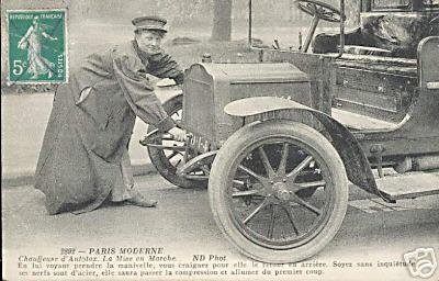 Picture (left): Starting the car. On seeing her take hold of the crank we fear for her if the car backfires. Don't worry, she has nerves of steel, she knows how to handle the compression stroke and start the engine on the first attempt.