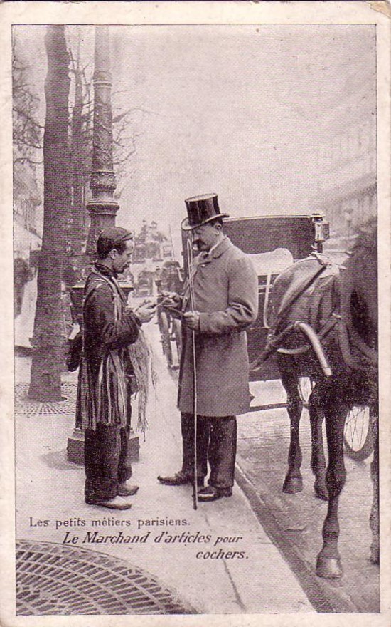 Picture (left): The Small Trades of Paris: The Vendor of Articles to Cab Drivers. Although turn-of-the-century Paris street scenes are often filled with fiacres, candid shots of cabs or drivers are relatively rare. In this case one of the street vendors who specialized in supplying necessities to cochers is shown making a sale.
