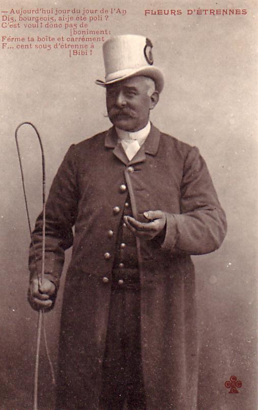 Picture (left): First Day Flowers Today is New Year's Day The card refers to the French custom of handing out gifts or special tips to servants on New Year's Day. In this case the cabbie is stereotypically presumptuous and ungrateful. The French "f..." word corresponds exactly to the familiar English "f..." word and is an especially crude way of saying "give".
