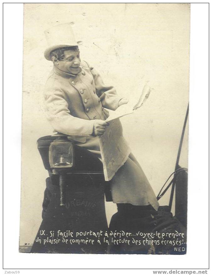 Picture (left): It's easy enough to sneer. See him taking a busybody's pleasure in reading about dogs getting run over. Another less than affectionate look at the cab driving fraternity, probably reflecting a class hostility between cab riders and cab drivers that must have lurked in the background of most cab trips. Middle class riders were used to dealing with docile servants and employees but cab drivers were outside their direct control and reveled in a degree of independence which could be upsetting and even frightening. The name "Urbaine" and what may be an obliterated cab number are visible below the driver's seat. The Compagnie Urbaine was one of the two largest cab companies in Paris. The driver is wearing the Urbaine's white uniform so he may be a real driver rather than an actor.