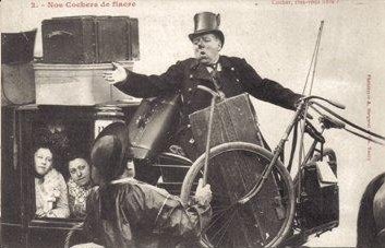 Picture (left): Cabbie, are you free? The gentleman with the cane poses a foolish question while the exasperated cab driver gropes for a suitably sarcastic reply. This card and the previous one are part of a ten-card series produced by Albert Bergeret, a former photolithographer based in Nancy. Bergeret began publishing postcards in 1898. By 1900 he was selling 25 million cards a year and by 1909 100 million.