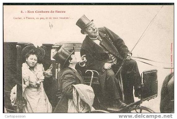 Picture (left): Cabbie, by the hour, at a walk, and drive wherever you want to. Yet another postcard featuring a couple in search of a little privacy and a slow, quiet ride. Slightly naughty postcards like this one probably did little more than raise a few eyebrows but the same theme was pursued in postcards that were too hot to send through the mails. One of these, entitled "À l'heure, à pas" ("By the hour, at a walk") showed very explicitly what ladies and gentlemen could get up to inside a cab.