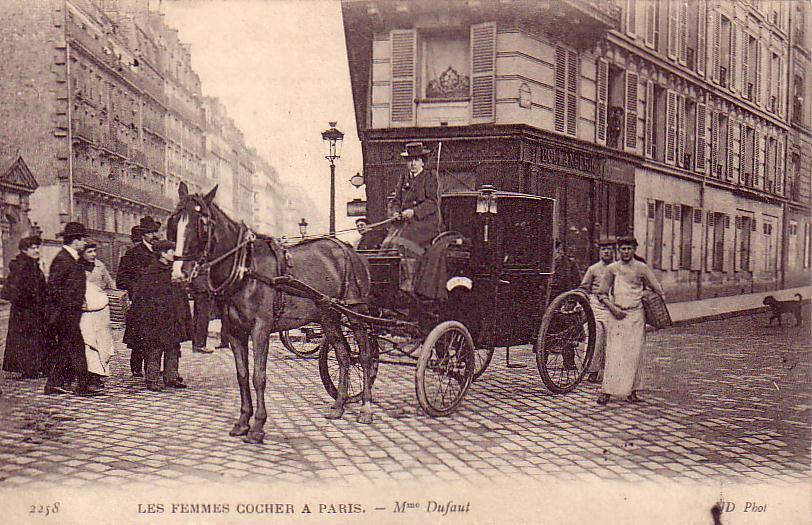 Picture (left): Mme. Dufaut. This photo may have been meant to show Mme. Dufaut cruising the streets for fares, but the scene has attracted the usual gaggle of gawkers, a couple of porters mugging the camera and an inquisitive dog in the background. There seems to be another cab parked behind Mme. Dufaut's. Large cities like Paris and London established legal cab stands but not nearly enough of them to accommodate the numbers of licensed cabs. With nowhere to park cab drivers "crawled" along the streets trolling for fares at the risk of being fined for obstructing traffic.