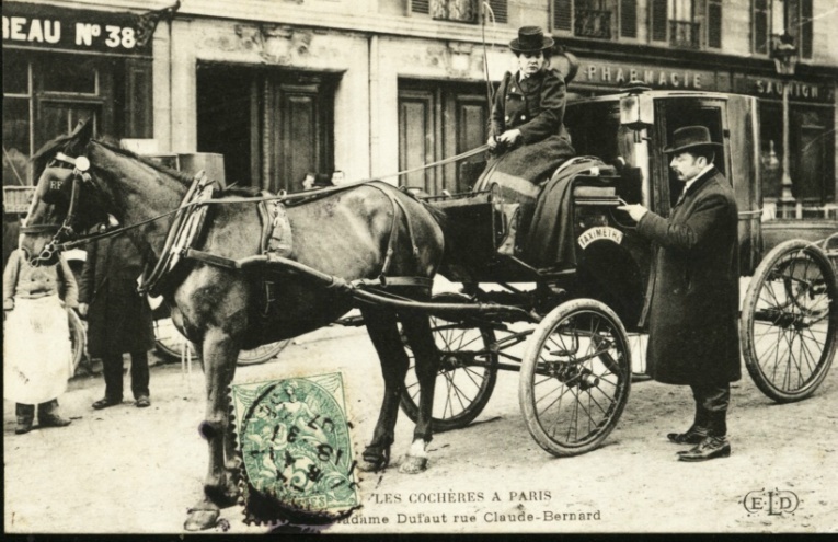 Picture (left): Madame Dufaut in rue Claude-Bernard. Another photo of Mme. Dufaut taken in front of number 38 rue Claude-Bernard. Since she isn't parked at curbside, the gentleman presumably represents someone hailing her in the street.
