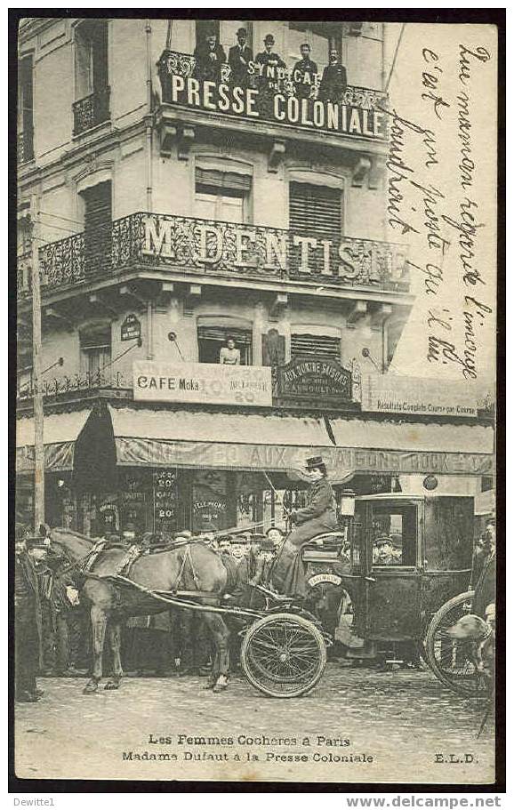 Picture (left): Madame Dufaut at the Presse Coloniale. The press had a vested interest in promoting newsworthy events like the appearance of the femmes cocher. Here Mme. Dufaut is visiting the offices of Presse Coloniale, presumably for interviews and a photo opportunity.