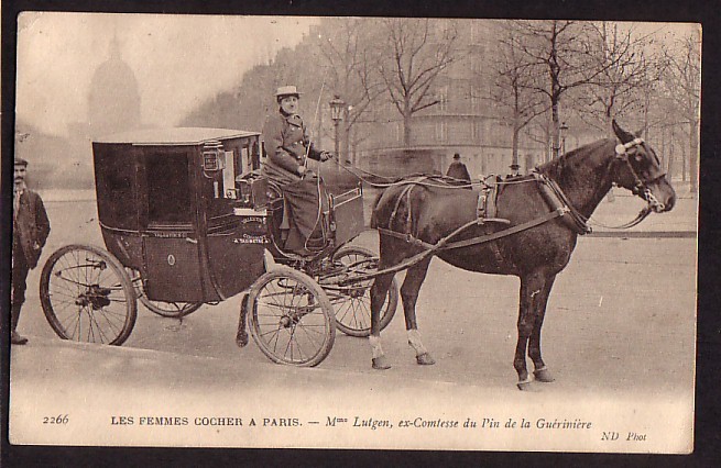 Picture (left): Mme Lutgen, ex-comtesse du Pin de la Guérinière. Mme. Lutgen on her cab. This shot may have been taken in the early morning. The streets seem quiet and it looks like there's a mist in the air. Mme. Lutgen is wearing what seems to have been the warm-weather version of her uniform – a white hat and an overcoat with dark trim around the collar.