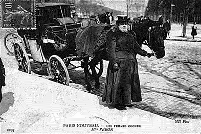Picture (left): Mme. Véron. Mme. Véron's cab is equipped with old-fashioned wooden-spoked wheels but they appear to be fitted with pneumatic tires. There also seems to be another cab in the background, perhaps waiting its turn to be photographed.