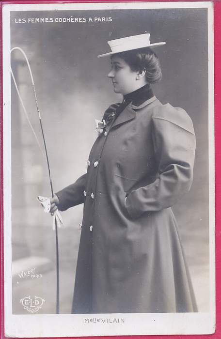 Picture (left): Melle. Vilain. Of the ten women represented in the various postcard series, six were married and four (Mademoiselles Vilain, Dollet and the Étienne sisters) were single. It would be interesting to know if this ratio also applied to the rest of the femmes cocher.