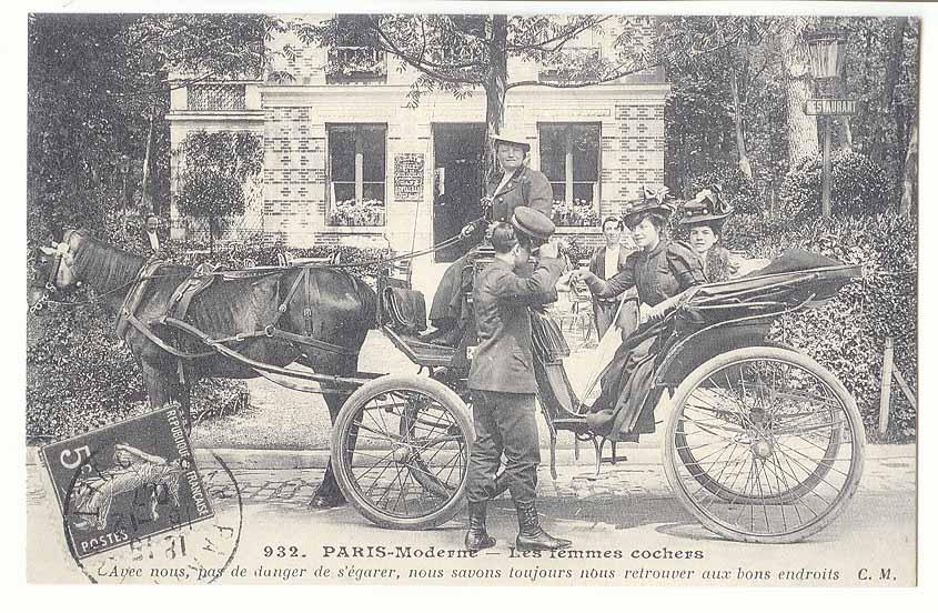 Picture (left): With us there is no danger of getting lost, we know how to get to the right places. Mme. Decourcelle delivers two ladies to a fine restaurant which appears in one or two other cards (see Rest & Relaxation, 10). Once again the postcard emphasizes the competence of the femmes cocher. This particular card is a modern reproduction by the Paris/Ile de France Department of Transport and Communications. A short history of the femmes cocher appears on the back of the card, but the driver is misidentified as Mme. Charnier.