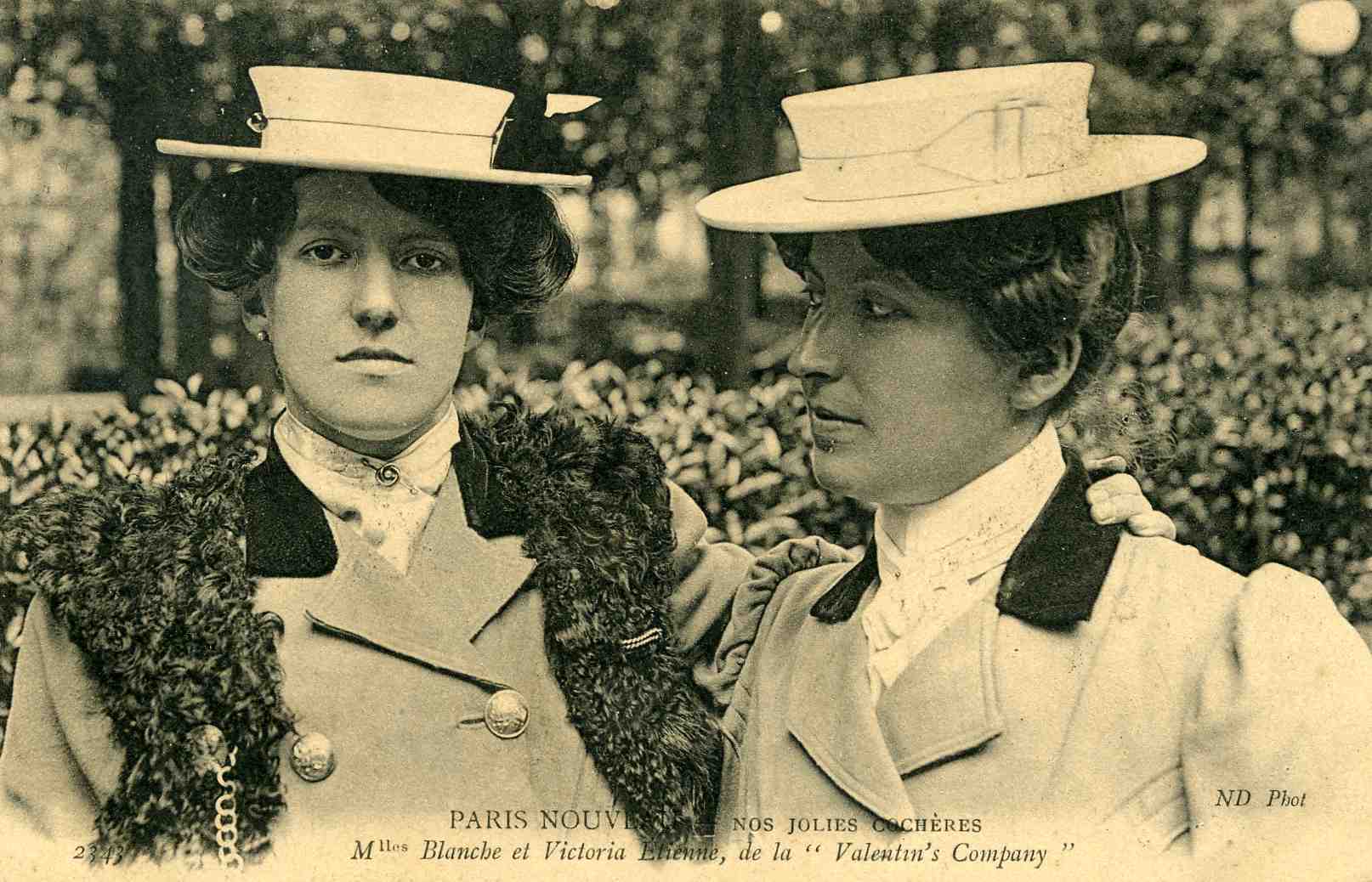 Victoria and Blanche Picture (left): Mademoiselles Blanche and Victoria Étienne, of the "Valentin's Company" The Étienne sisters added a touch of glamour to the femmes cocher scene and they starred in their own series of postcards entitled "Nos Jolies Cochères" ("Our Pretty Cab Drivers").