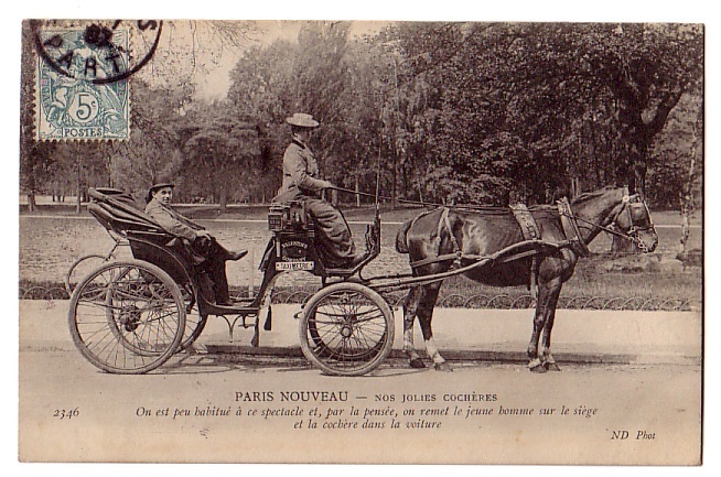 Victoria and Blanche Picture (left): We are not accustomed to this spectacle, and in our imagination, we transpose the young man onto the driver's seat and the cab driver into the carriage. When the femmes cocher first appeared many people couldn't believe their eyes. Victoria Étienne is the driver in this photo.