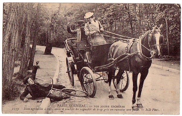 Victoria and Blanche Picture (left): Lovely to look at, but if you want too close a look you'll come a cropper. The femmes cocher postcards resisted the temptation to make cheap jokes on the "woman driver" theme. It was the cyclist in this little melodrama who caused the accident by letting his attention wander.