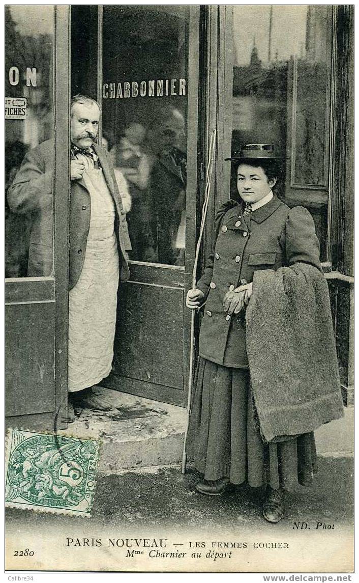 Picture (left): Mme. Charnier setting off. Why, we might ask ourselves, is a bartender seeing Mme. Charnier off to work? The answer is that horse-cab drivers – in common with workers in other turn-of-the-century occupations – had no qualms about consuming alcohol before, during and after business hours. Exposure to cold and rain during brutally long shifts made drink a psychological if not a medicinal necessity. In this as in other professional requirements of cab driving the femmes cocher proved equal to the challenge.