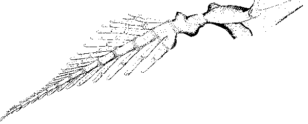 A theory which must be discussed is the fin-fold theory of the origin of paired limbs. Some ancient fishes had a paired ventral fin seam, the reduction and distortion of which might form bilaterally paired fins. Under the proposed model, this double fin seam evolves from the ends of the rib pairs. The few paired fins which seem to have evolved in this way are relatively simple; they do indeed seem to have migrated from the axial skeleton, leaving gaps in the series of ribs. This theory is appealing in that it does not require the theoretically difficult process of adding new articulated parts. But it does not address the question of the origin of the skeletal elements which are distorted. And more importantly, in the lungfish-coelacanth-rhipidistian lineages the axial ribs show no gaps, and the limbs are complex and show a fading internal bilateral symmetry which should not be present if their parts had migrated from the axial skeleton.