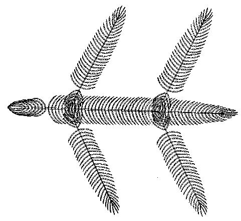 The formation of the more complex arthropods and vertebrates requires additional steps of parabiotic mutation and subsequent reduction. To create the basic arthropod form, the chain-organism is itself multiplied, as in the Figure 1, or through some similar process. Out of various possibilities, natural selection favors a form with a segmented axial skeleton with segmented radials branching to the sides. Again, size is increased, and new possibilities arise for specialized organs to evolve through the adaptive distortion of segments. The progenitor consists of many symmetrical unspecialized parts, a nascent mass of morphological raw material.