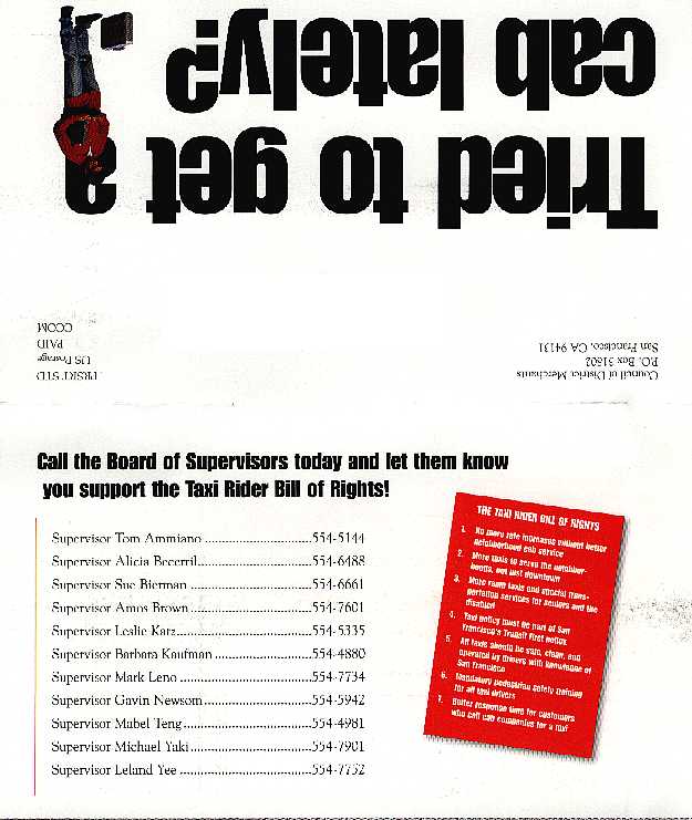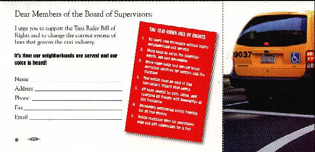 The taxi mailer asks recipients to call members of the Board of Supervisors to support enactment of a seven-point ``taxi rider bill of rights.''