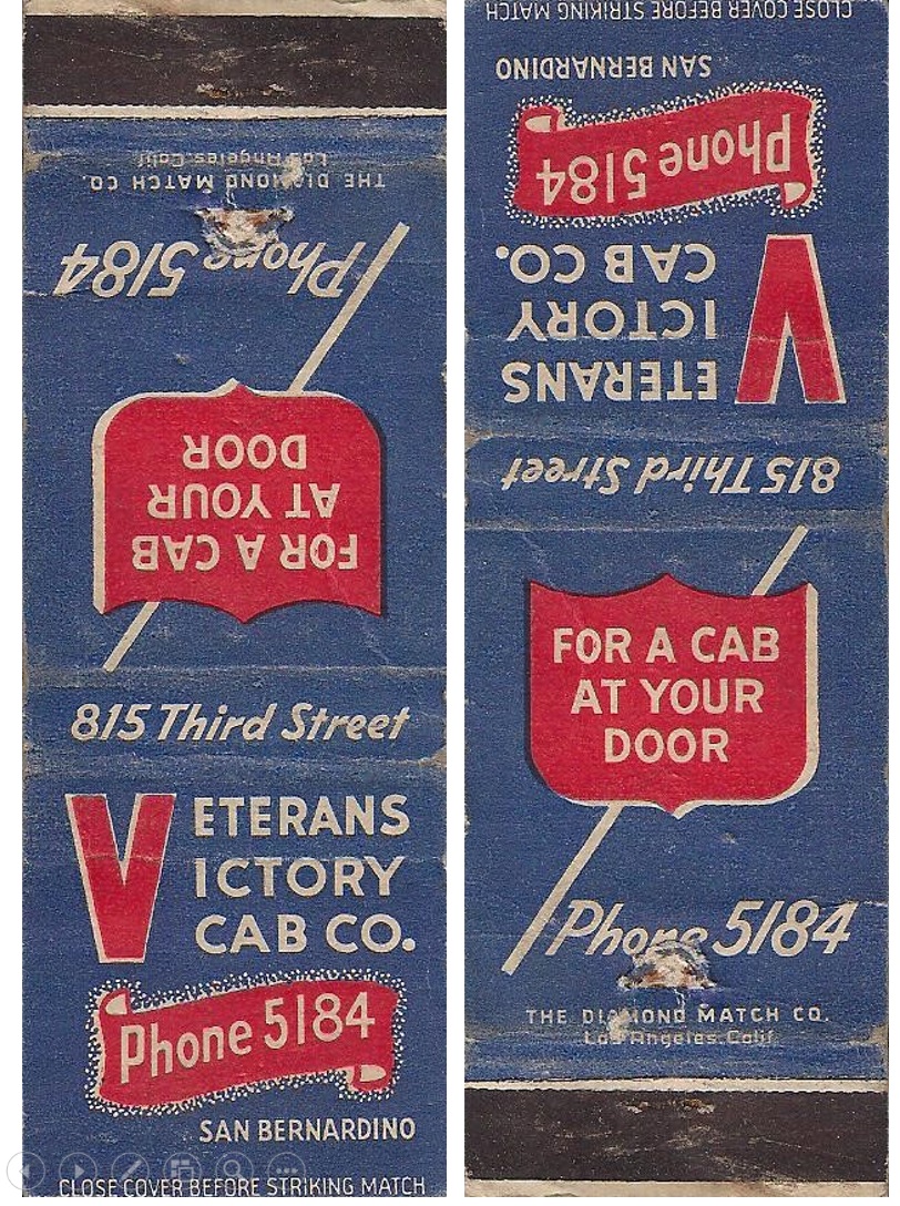 In March, 1946 the Victory Cab Co. changed its name to Veterans Victory. In December, 1947 it went out of business and sold off its fleet of 1946 and 1947 Dodges, Plymouths and Fords. (San Bernardino Sun, 1946-03-20 p. 7 and 1947-12-06 p.3 (California Digital Newspaper Collection).