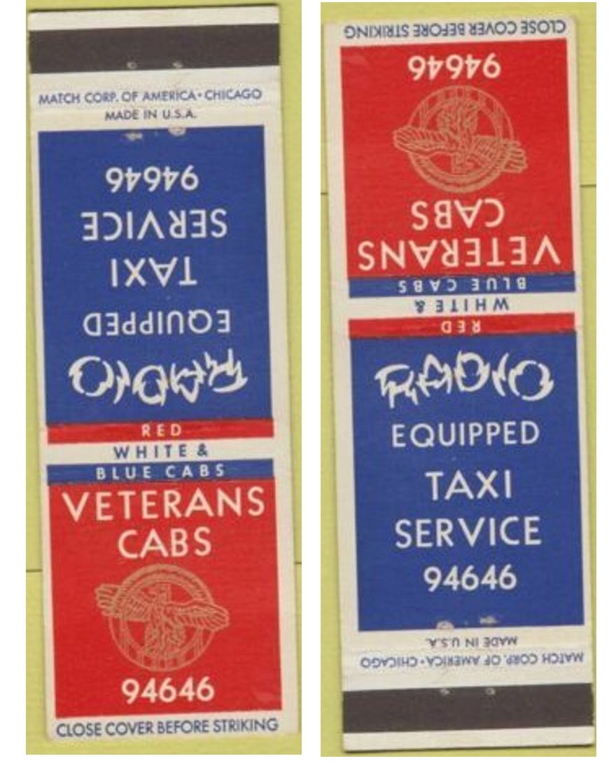 Veterans Cabs was apparently associated with Red White & Blue Cabs. Once again, Chicago is not identified but the tipoff is the company's distinctive eagle logo which shows up in a 1946 newsreel.