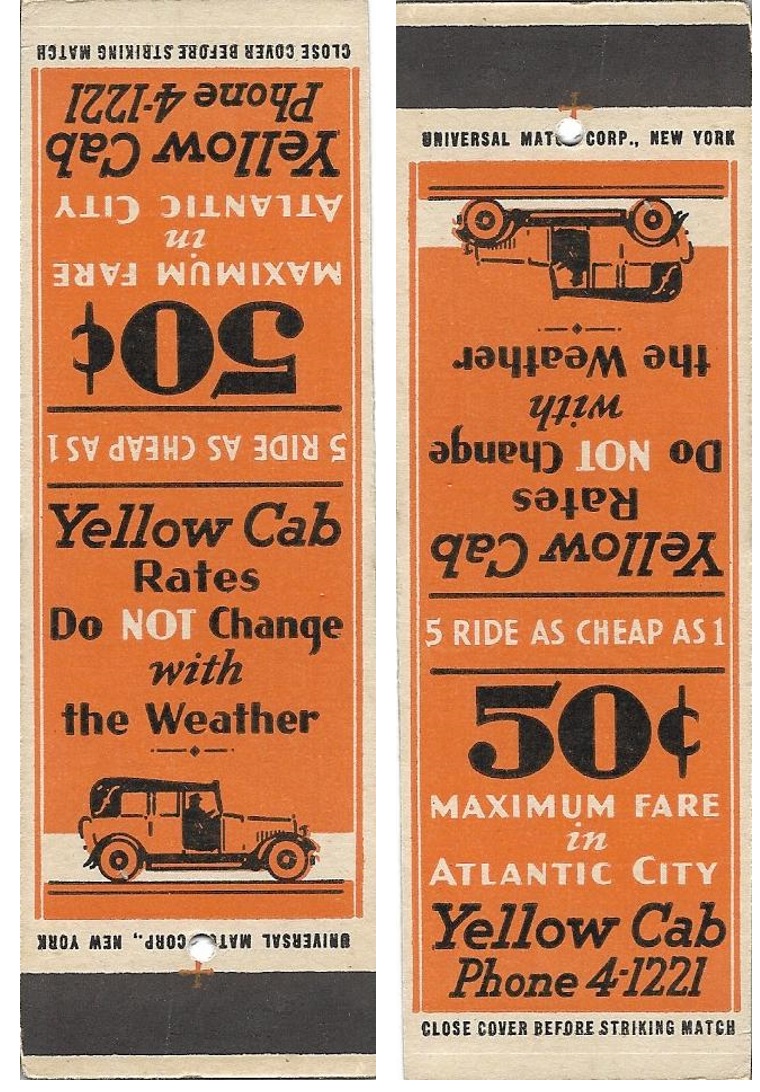 The selling points on this matchbook may have been responses to competition from jitneys or cut-rate cabs (next page): a 50-cent flat rate, charging by the 5-passenger carload instead of by the head, and the same charge regardless of weather.