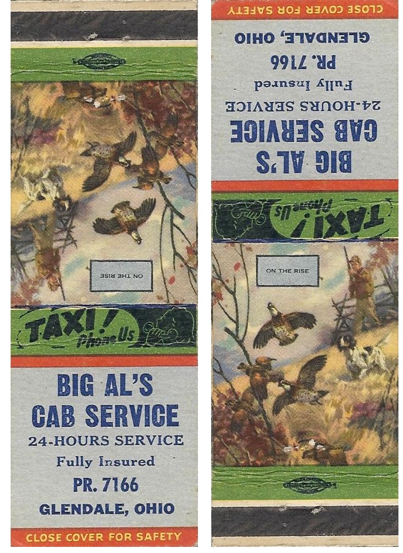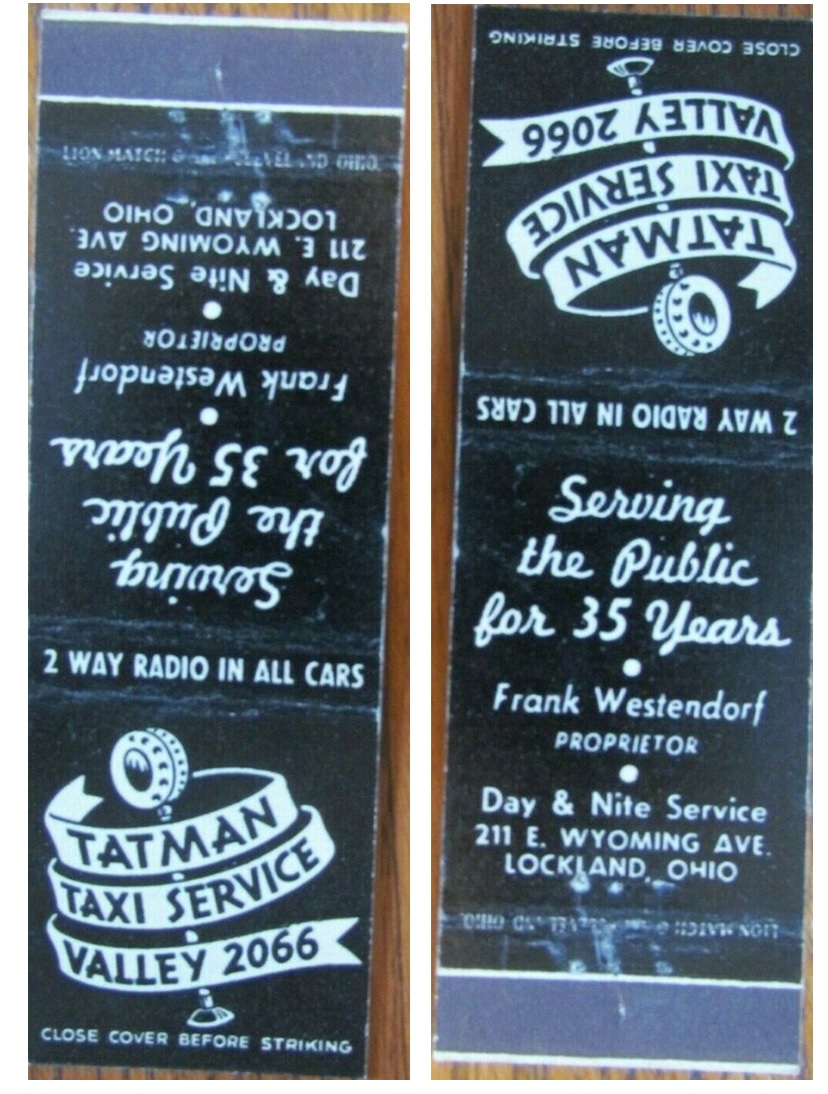 Frank Westendorfer died in 1959 after owning Tatman for 39 years, dating this matchbook as 1955. For once radio dispatching is represented by something other than lightning bolts (a microphone). Cincinnati Enquirer 1959-08-12 p. 21.