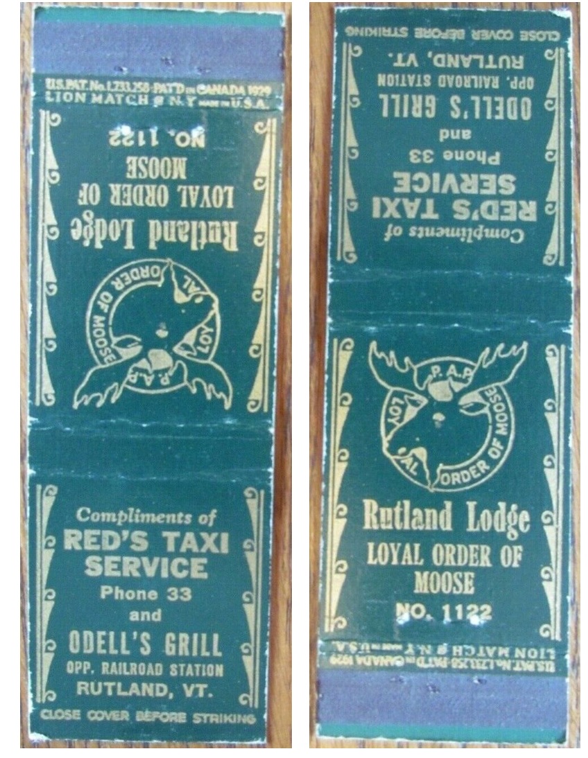 Francis "Red" Burke (1907-1986) owned and operated Red's Taxi for more than 50 years, retiring in 1985. Notwithstanding the Moose Lodge ad on the matchbook, Mr. Burke was an Elk. Rutland Daily Herald, 1986-09-30 p. 6.