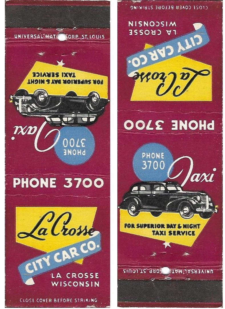 1936 ad with same phone number: "25c Per Passenger Anywhere in LaCrosse and 5c for Each Additional Passenger to Same Destination." Wisconsin Catholic Club Woman, 1936, p. 4.