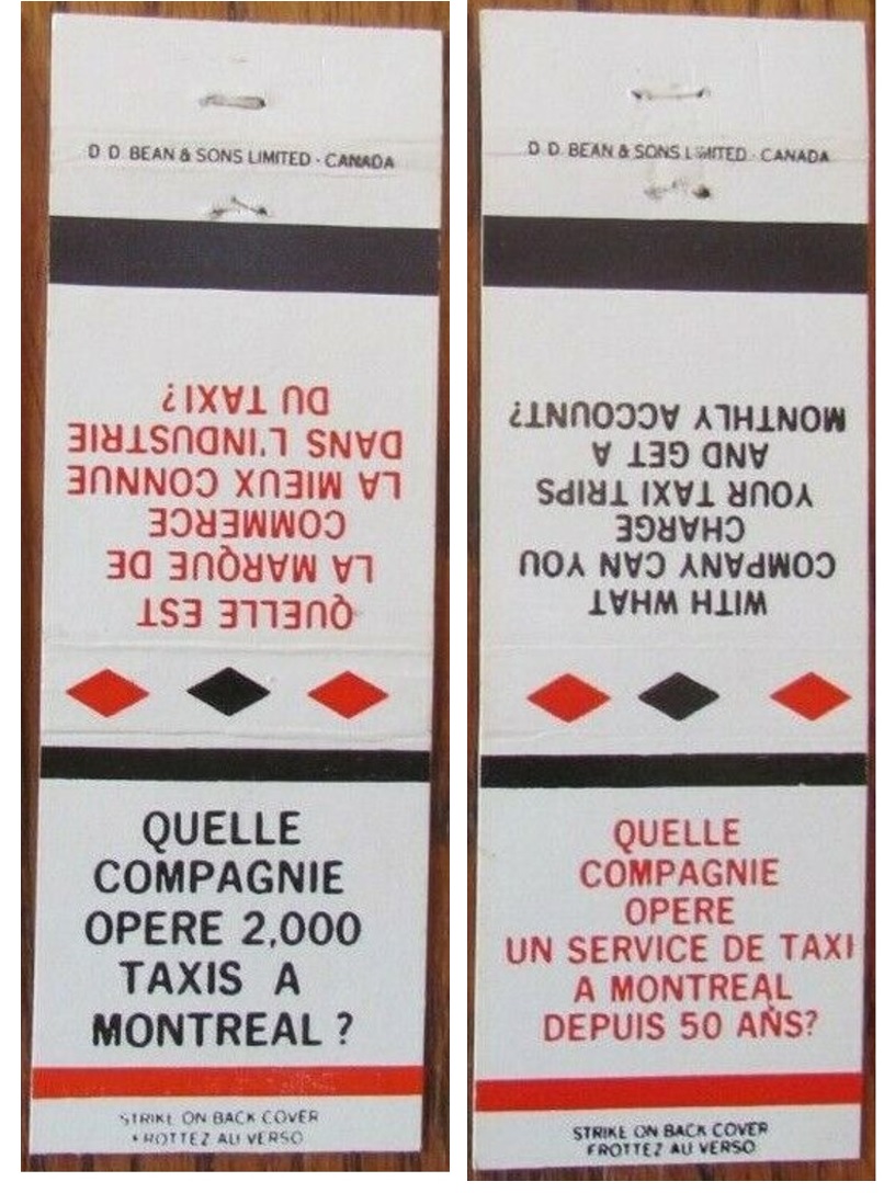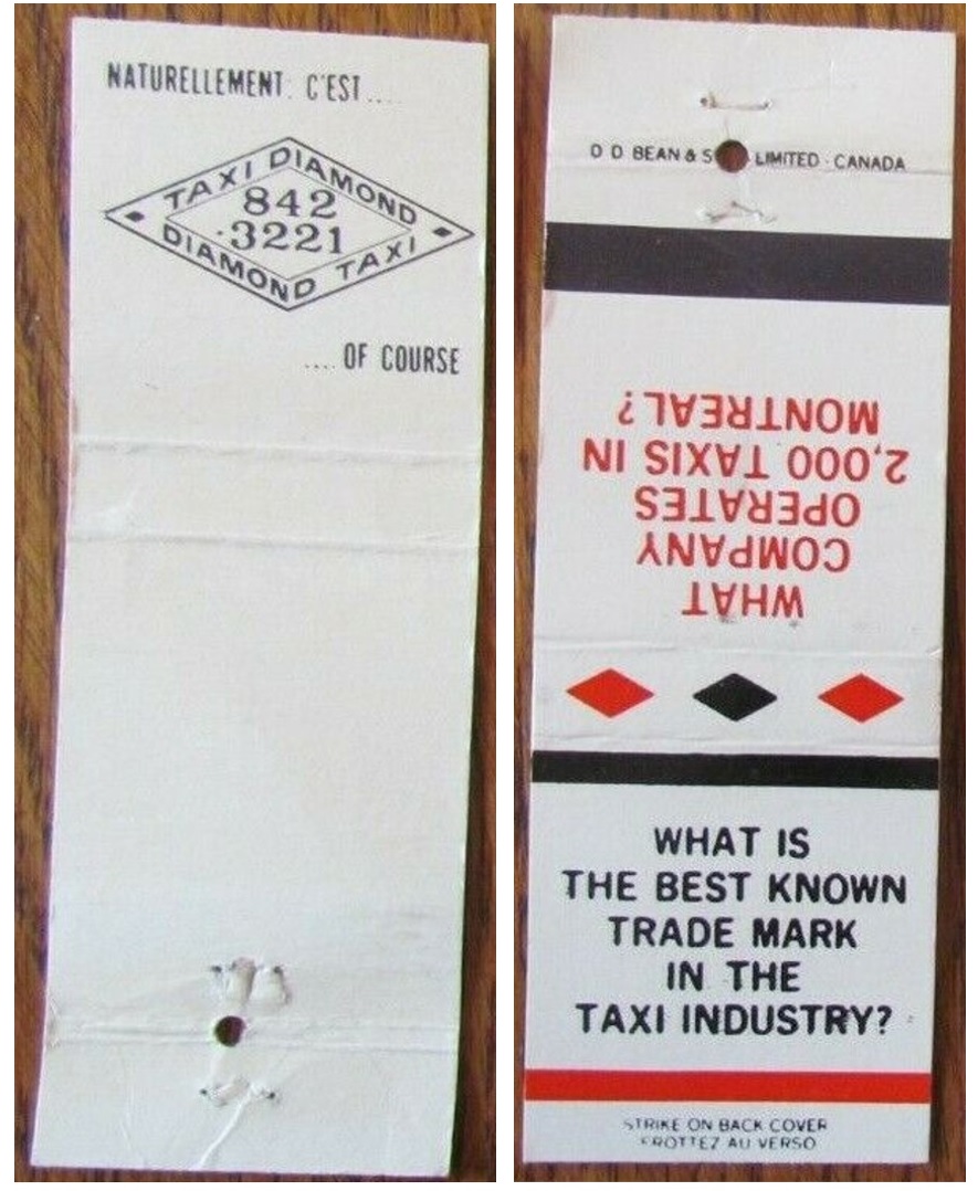 In this interesting ad campaign, Diamond issued a series of matchbooks with quiz questions about the company and its services. Some of the matchbooks were in English, some in French and some bilingual. The answer in all cases ("Diamond Taxi of course") was found by opening the matchbook.