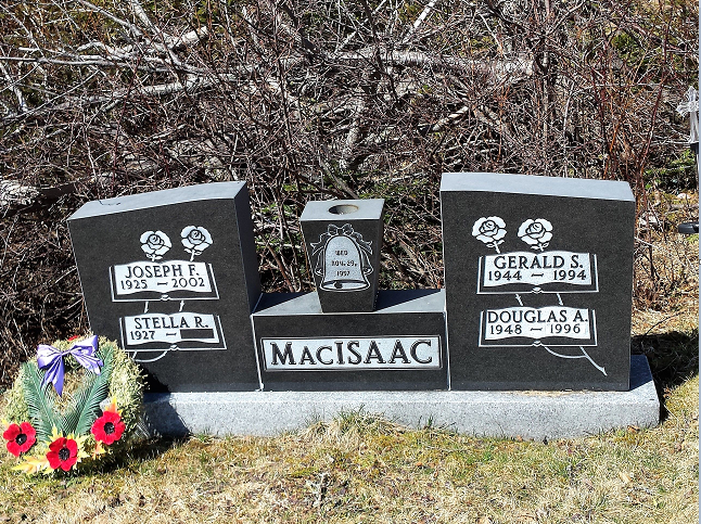 [Next column] Doug MacIsaac is buried in Fourth Hill Cemetery in Canso, Nova Scotia, with his father and older brother Gerald. Photo by Jody MacKeil . (Source: Find a Grave).