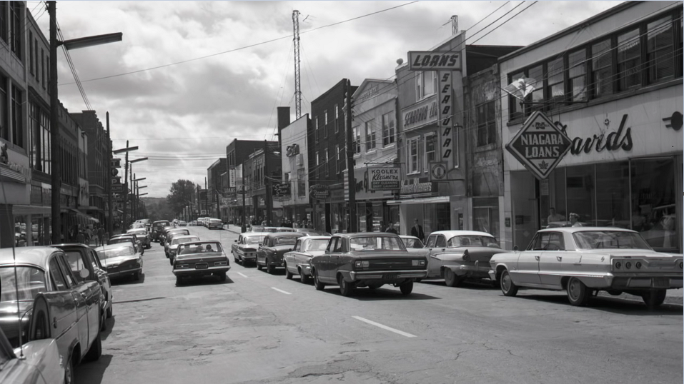 Charlotte Street, Sydney, circa 1970. (Source: Shooting the Drag in Sydney, Cape Breton, a film by the iCreate Cape Breton youth documentary team (6:53 minutes) with photos from the Beaton Institute, Cape Breton University).