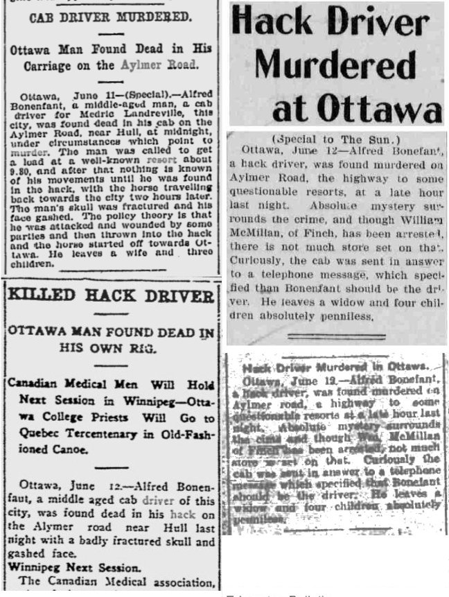 Ottawa, June 12 -- Alfred Bonenfant, a hack driver, was found murdered on the Aylmer road, the highway to some questionable resorts, at a late hour. Absolute mystery surrounds the crime. William McMillan, of Finch, has been arrested, but not much store is placed upon his capture. Curiously the cab was sent in answer to a telephone message which specified that Bonenfant should be the driver. That is the last known of Bonenfant until he was found dead. He leaves a widow and four young children absolutely penniless.