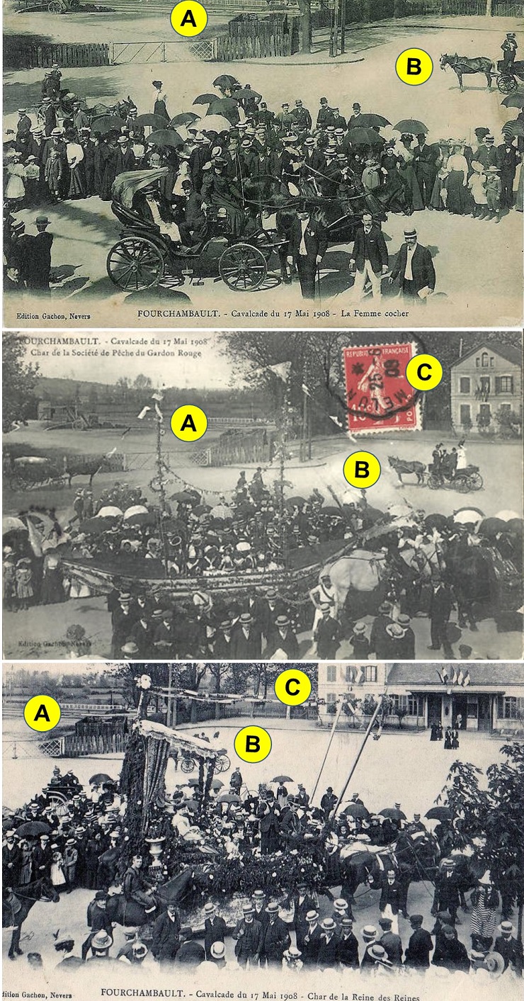 1. Introduction / Page 3 Could this be Mlle Dollet? "Yesterday morning at the Prefecture of Police Mlle Désirée Dolet successfully passed the theory examination with a view to obtaining permission to drive an automobile taxi. Monday she will undergo the practical examination, at the walking speed of a horse." Le Petit Parisien March 24, 1907, p. 2 (RetroNews). 1. Introduction / Page 5 For the decline in the numbers of women cab drivers, see "Fewer woman cabbies," New York Times, January 12, 1908, part 3, p. 2, col. 6. 1. Introduction / Page 10 This closeup of the Fourchambault cab shows a hand wheel (yellow circle) similar to the one on Madame Véron's meter (Madame Véron, page 1). ![]() The cab and driver look genuine, but are they local? According to Agnès Sandras (Postscript, page 18) Inès Decourcelle and Marie Moser drove cabs in the summer carnival parade in Calais, nearly 300 km north of Paris. Could this be another Paris femme cocher taking part in a publicity stunt? Two other photos taken from approximately the same vantage point suggest that the cab took part in the "cavalcade" (parade) that presumably kicked off the fair, and may even have led it with digitaries as passengers. The top photo shows the cab in the foreground. (A) marks a gateway that appears in the other two photos. (B) is a carriage whose passengers are standing up to watch the parade. In the middle photo the foreground now shows a float in the shape of a boat sponsored by Société de Pȇche du Gardon Rouge (Gardon Rouge Fish Company. The gardon rouge is a European freshwater fish called the rudd in English). (C) is a building that also appears in the third photo. The bottom photo shows a float carrying the Queen of Queens on a throne (perhaps a local beauty contest winner). Top and middle photos: delcampe.net. Bottom photo: Wikipedia Commons. ![]() 2. Madame Charnier / Page 4 For solid rubber tires and harness bells in London, see G. N Georgano, A History of the London Taxicab (New York: Drake Publishers, 1973), p. 34. 2. Madame Charnier / Page 8 Information about meters and other details about the Paris cab trade comes largely from Nicholas Papayanis, Horse-Drawn Cabs and Omnibuses in Paris (Baton Rouge: Louisiana State University, 1996). 4. Madame Lutgen / Page 4 For more about foot warmers, see Toasty Toes...Learning to Use an Antique Carriage Foot Warmer!, posting by Blacklocust on the Spunkysbuggy blogspot, February 2, 2016. For one in use, see Winnipeg Cab History. See also index, "Heated cabs." 4. Madame Lutgen / Page 5 For her employment as a nurse, see "Countess a nurse," New York Times, December 26, 1913, p. 1. 5. Madame Moser / Page 4 For tipping in the 1880s see L.J. Ransone, Good Form in England, by an American Resident in the United Kingdom. (N.Y.: Appleton, 1888), p. 278. Accessible via Google Books. 10. Cab Horses / Page 4 For Madame Lutgen's charges of cruelty to horses, see "A Paris Horror," New York Times, October 13, 1907, p. C4. 10. Cab Horses / Page 8 For the cab driver quotation see Anna Sewell, Black Beauty, any edition, chapter 34. 13. Femmes Chauffeur / Page 1 For Bertha Benz's long distance motor trip, see Cyril Posthumus, The Story of Veteran & Vintage Cars (London: Hamlyn, 1977), p. 11. Ten years later, in 1898, there were several women driving cars around Paris. The most notable of these was Marie-Clémentine de Rochechouart-Mortemart, duchesse d'Uzès (1847-1933), who combined the avocations of militant feminist, sculptor and monarchist. The duchess quickly accumulated several speeding tickets, not difficult to do at a time when anything faster than a walking pace was deemed dangerously excessive. There were enough women drivers in 1898 for the Paris newspapers to take notice and christen them "chauffeuses," a term that offended the Duchess. It literally meant "stoker" and dated back to the time when chauffeurs drove locomotives and shovelled coal into fireboxes. The Duchess appealed to the press asking them to use the English term "motor woman" instead. ("Automobiles in Paris," Anaconda (Montana) Standard, July 31, 1898, p. 12 (Newspapers.com OCR text). It was the Duchess d'Uzès who "endorsed" Marie Lutgen's decision to become a cab driver (Madame Lutgen, page 5; Postscript, page 22.). 13. Femmes Chauffeur / Page 2 Although one might assume that women taxi drivers evolved from women horse cab drivers, the evidence shows that the two occupations emerged almost simultaneously. By her own account, Inès Decourcelle passed her taxi driving exam on February 27, 1907, two days after Eugénie Charnier and Clémentine Duffaut had their first horse-cab shift. ("Du Fiacre au Taxi-Automobile," La Vie au Grand Air, May 16, 1908, p. 10 (RetroNews). Mme Decourcelle was inspired to drive a taxi after reading about a woman who was already driving one, and other women soon followed their example.