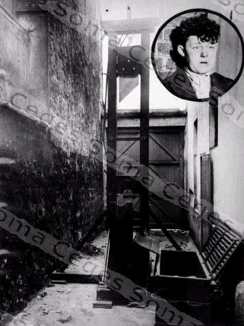 An execution for capital murder at Versailles (May 5, 1931). "At dawn, in the place des Tribunaux, at Versailles, the guillotine was set up in front of the prison door for the execution of Georges Loos [inset] who killed the taxi driver Charles Peretto." (New York Times. Wide World Photos).