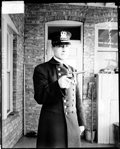 Policeman, Thomas A. Lanan, standing with his pistol drawn [1915]. DN-0063899, Chicago Daily News negatives collection, Chicago History Museum; search the photo ID number at the American Memory web site for more information.)
