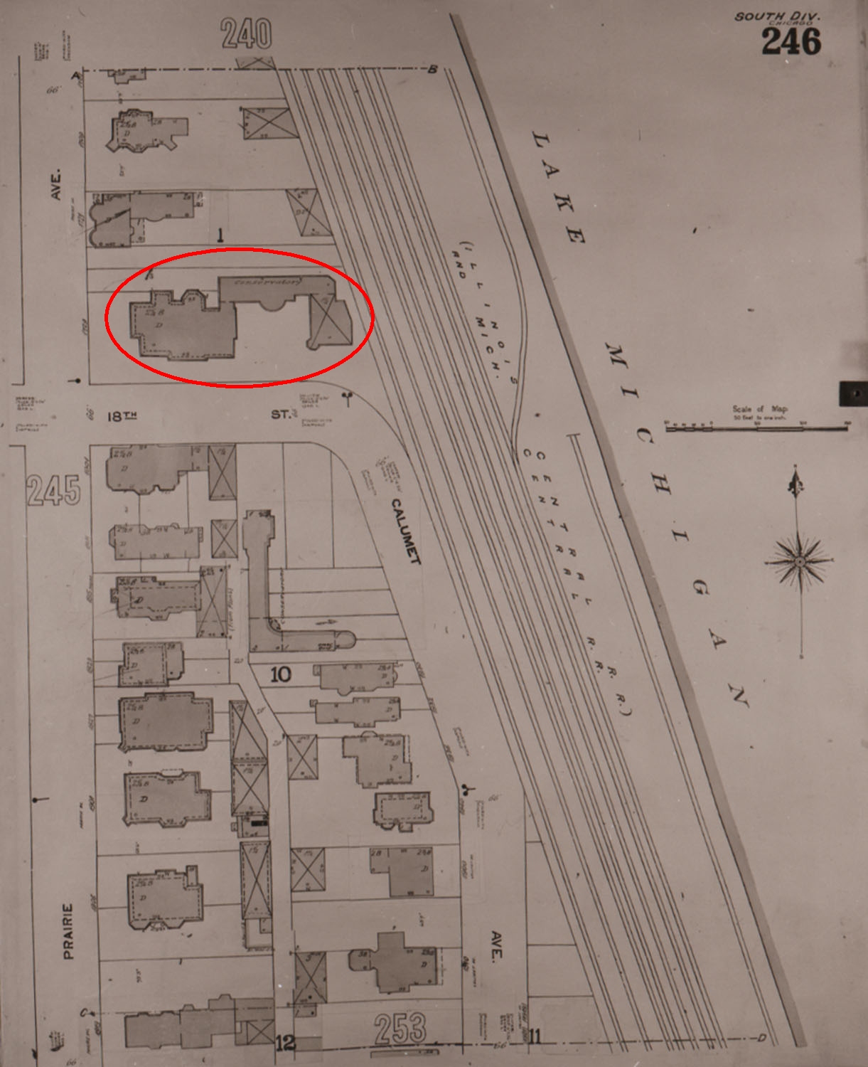 Top: Residence of George M. Pullman at 1729 South Prairie Avenue where Robert Campion's cab was found, Cab hold-up affair. DN-0006034, Chicago Daily News negatives collection, Chicago History Museum; search the photo ID number at the American Memory web site for more information.) Bottom:Pullman Mansion -- Prairie Avenue Map at Pullman State Historic Site web site.