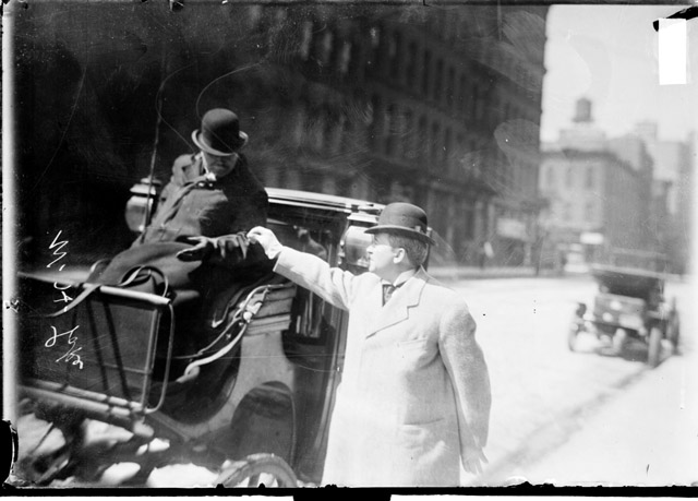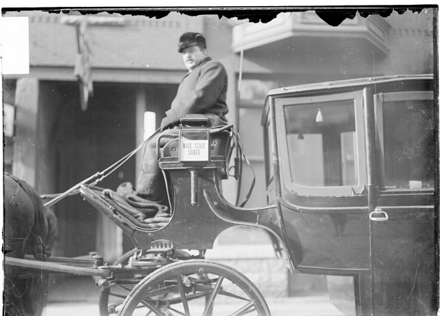 Top: Livery drivers' strike [1903], man driving a horse drawn carriage with a sign about the strike on the side of the carriage seat. (DN-0001719, Chicago Daily News negatives collection, Chicago History Museum. Bottom: W. H. Lake paying a cab driver sitting in his horse drawn carriage (DN-0008289, Chicago Daily News negatives collection, Chicago History Museum). (Search the photo ID numbers at the American Memory web site for more information.)
